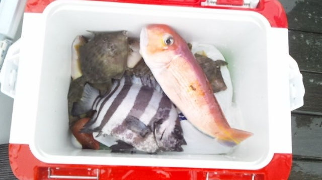 今回の釣果 赤いのがアマダイ 縞模様がイシダイ、あとはフグ・カワハギ・オコゼ・ベラ