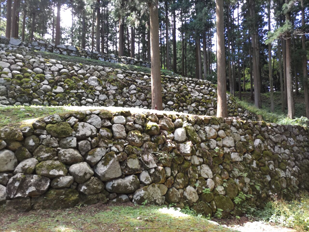 森の中に数段の石垣があり、その向こうに本丸の石垣が見える。