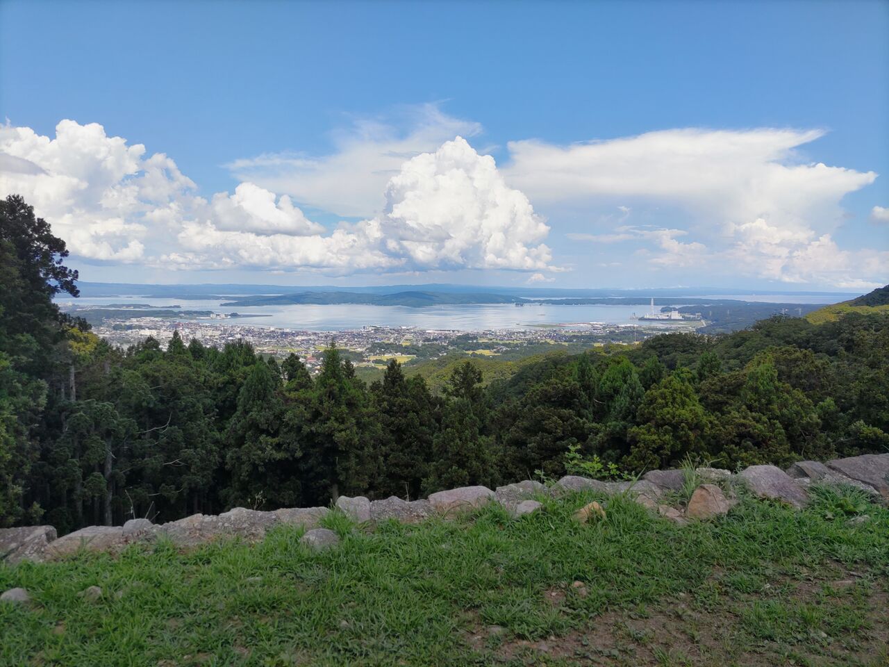 石垣の上に立つと麓の七尾市街と能登湾、その向こうに能登島が見える。