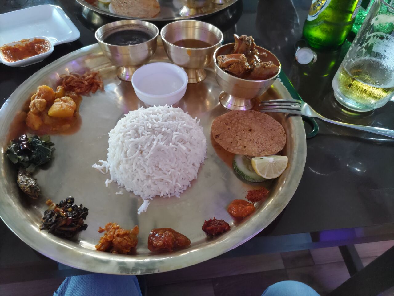 夜、フジホテルの近くのレストランで飲んでネパールの定食ダルバートを食べる。